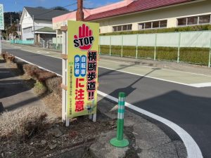 学校・園舎のすぐ南西の角あたりの横断歩道は、多くの子ども(児童園児に限らず)が利用します。この道路は交通量が多いものの、信号もなく、交通事故が心配な場所です。子どもたち自身が横断に際して、細心の注意を払うことはもちろん、ドライバーの皆さんにも注意いただきたいと思い、看板を設置しました。