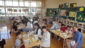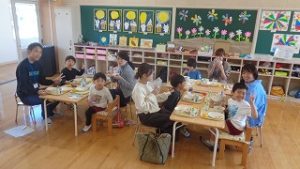 続いて給食試食会を行いました。中西栄養士から丹波篠山の給食について、栄養面のことや調理において気を付けていることなどを映像を交えてお話を聞かせていただきました。そのあとは、いよいよ給食の試食です。今日の献立は、子どもたちに大変人気のある揚げパンでした。親子でいつも以上においしそうにいただく園児の笑顔がかわいらしかったです。