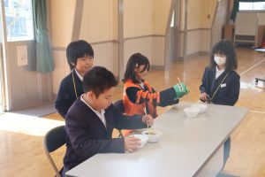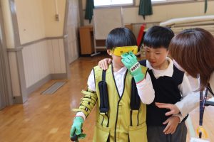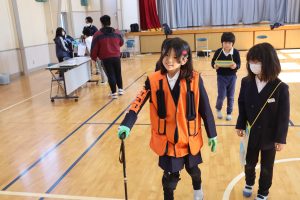手袋やゴーグルなどを着用し、手指感覚の低下や視力の低下、視野の狭さを体験しました。ペットボトルの蓋を箸でつかむなどの日常動作にも挑戦。自分たちが普段簡単にできることが、高齢者の方には大変なことだと身をもって実感する機会になりました。「お年寄りが困っていたらお手伝いしようと思いました。」と振り返っていました。今後の生活に活かしてほしいです。