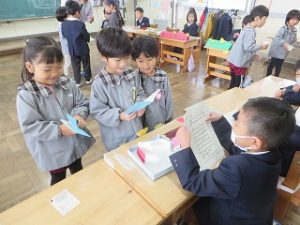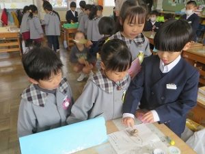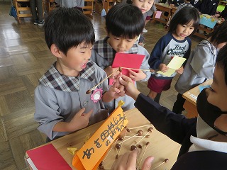 11月27日(木)、1年生が“秋見つけ”で集めたドングリの実などを使っておもちゃランドを開き、そこに幼稚園のお友だちを招待してくれました。約束の時間に1年生教室に向かうと1年生が出迎えてくれ、「あ。お兄ちゃん!」とすぐにペアのお兄さん・お姉さんを見つけ、自然と手を繋いで1年生教室に入っていきました。一人一枚、スタンプラリーのカードをもらっておもちゃランドの説明を聞き、2~3人のグループに分かれて順番にブースを回っていきました。おもちゃは、ドングリなどを転がして遊ぶ迷路、マツボックリのボウリングやけん玉、ドングリのやじろべえやコマなどがありました。子ども達は、遊び方やコツを1年生に教えてもらいながら、どのおもちゃも楽しそうに遊んでいました。