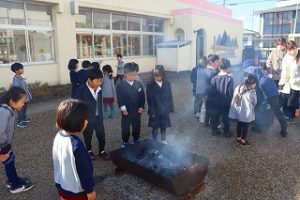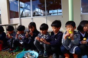 そして、朝早くから準備してもらった火の中にさつまいもを投入。「おいしかった~。」「もっと食べたい!」と二個目をおかわりしたい子もいました。出来上がったやきいもを食べると、心も体もほかほかになりました。