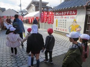 今年は午年。市指定文化財の「黒神馬」は、とても大きくて迫力があり、歴史を感じながらじっくり見ました。そして、春日神社の表参道から篠山恵比寿神社へ進みました。熊手等の縁起物が並べてあり、「商売繁盛で笹もってこい!」の音楽が聞こえていました。