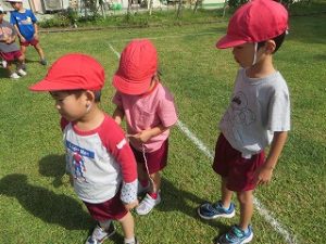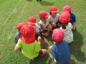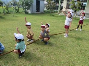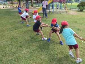 幼小合同運動会が終わっても、子ども達は毎日たくさん体を動かして運動遊びを楽しんでいます。しっぽ取りやリレー、玉入れ、大玉転がし、綱引き等をして、走る、投げる、転がす、綱を引く、踏ん張る等、いろいろな体の動きを楽しんだり、力の使い方や調節の仕方を学んだりしながら楽しんでいます。繰り返し遊ぶうちに、「白組集まれー!」とチームの仲間に声を掛けたり、「しっぽ、つけてあげる。」とさりげなく年少児のことを助けてくれたり、「走る順番、どうする?」と自分達で相談したり、「赤組、がんばるぞー!」「オー!!」と掛け声をして気持ちを高めたり…と、年長児が主体となって遊びを進めていく姿がたくさんみられます。17日(金)には、篠山幼稚園・岡野幼稚園の友だちと一緒に“みんなカーニバル”という合同運動会を開催する予定です。たくさんの友だちと一緒に運動会ができることを楽しみにしている子ども達です♪