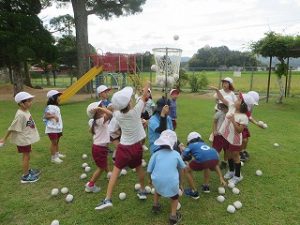 幼稚園では、運動遊びを楽しんでいます。玉入れが終わり、玉片付け競争をしていました。