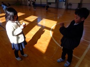 こども園や幼稚園の頃から親しんできた「こま回し」や「けん玉」。1年生の生活科の時間に挑戦すると、子どもたちの目はキラキラと輝き出します。「これ、園でもやったことある!」「得意!」と、自信満々に教えてくれる姿はとても頼もしいです。昔ながらの遊びは、指先の細かな動きや、力加減の調節など、学習の土台となる力を育んでくれます。園で培った「楽しい!」という気持ちを大切に、一歩先の楽しさを共有していきたいと思います。