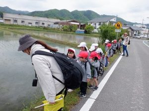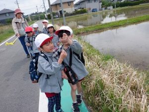 ぽかぽかと暖かい日差しと心地良い春風が吹く中、5月12日(月)に春の遠足に出かけました。大きなリュックにお弁当とおやつ、そしてワクワクした気持ちや喜びを胸にいっぱいつめ、よし池公園を目指して園を出発しました。よし池公園までの道中では、植えられたばかりのイネが並ぶ田んぼを覗いたり、道端の草花に目を凝らしたりしながら生き物探しを楽しみました。田んぼにはアメンボやイモリがおり、気持ち良さそうに泳いでいました。道端では赤や黒、オレンジといったいろいろな色のテントウムシをたくさん見つけたり、草花を摘んだりしながらよし池公園を目指して歩きました。
