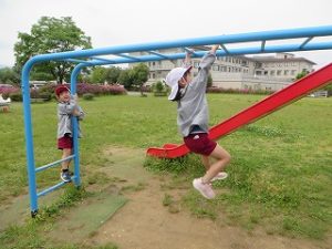 よし池公園では、滑り台やジャングルジムが繋がった複合遊具や、ブランコ等の遊具で遊んだり、鬼ごっこをしたりして、たくさん体を動かして遊びました。