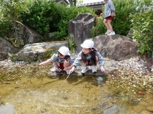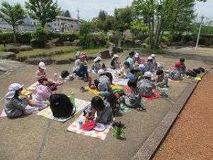 たくさん体を動かした後は、待ちに待ったお弁当タイム♪お弁当を作ってくれたお家の方に“ありがとう💛”の気持ちをもってみんなでおいしくいただきました。昼食の後も市民センター内のビオトープを覗いて生き物探しをしたり、植え込みの近くを散策したりして、自然にたくさんふれた楽しい遠足となりました♪